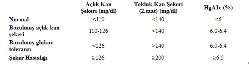 Dünya Sağlık Örgütü'nün (WHO) şeker hastalığı için tanı kriteri; belirtileri olan hastalarda yüksek kan şekeri düzeyi veya belirtileri olmayan hastalarda açlık kan şekeri düzeyinin 126 mg/dl üzerinde olması ya da glukoz tolerans testinde 2. saat ölçümünün 200 mg/dl üzerinde olmasıdır. Tipik belirtileri olan hastalarda rastgele kan şekeri düzeyinin 200 mg/dl üzerinde olması veya glikolize hemoglobin düzeyinin % 6.5’in üzerinde olması bir diğer tanı koyma metodudur.